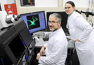 Für ihre Experimente nutzten die Forscher eine Reihe eleganter Methoden. Zunächst züchteten sie Mäuse, die sogenannte Fluoreszenzproteine herstellen, und bei denen deshalb unter dem Mikroskop die Dendritischen Zellen grün und die Mastzellen rot leuchten. Dadurch konnten sie mit Hilfe intravitaler Multiphotonen-Mikroskopie bei einer Entzündungsreaktion in der Haut nun live beobachten, wie diese beiden Zelltypen miteinander interagieren. Um das Zellverhalten jedoch nicht nur zu beobachten, sondern auch zu quantifizieren waren Bioinformatiker gefragt: Prof. Marc T. Figge leitet die Forschungsgruppe Angewandte Systembiologie am Leibniz-Institut für Naturstoff-Forschung und Infektionsbiologie in Jena. Er und seine Mitarbeiterin Dr. Anna Medyukhina entwickelten Algorithmen, die die automatisierte Analyse hunderter Interaktionen zwischen Mastzellen und Dendritischen Zellen ermöglichten.