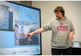 Dr.-Ing. Ingo Siegert erklärt den Kindern, woran er forscht und welche Hilfsmittel und digitalen Systeme er dafür nutzt. Fotograf: privat