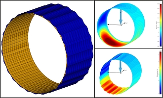 Ziel des Projekts ist die Implementierung von Bump-Type-Folienlager in eine rotordynamische Simulation, um Campbell-Diagramme unter Berücksichtigung der Nichtlinearität der Lager sowie nichtlineare Hochlaufanalysen durchführen zu können. Das Vorgehen umfasst eine numerische Online-Lösung der Reynoldsgleichung, die auf das ideale Gasgesetz angewendet und mit verschiedenen Modellen für die Folienverformung kombiniert wird. Ein gängiger Ansatz ist die Verwendung einer 1d-Diskretisierung in Umfangsrichtung unter der Annahme stationärer Bedingungen, wofür häufig eine analytische Formulierung der Steifigkeit der Bump-Folie oder ein Finite-Elemente-Modell der Top-Folie genutzt werden. Dieser Ansatz wird zunächst zu einem 2d-Ansatz erweitert, um eine Fehlausrichtung oder Kippbewegung der Welle zu berücksichtigen. Um zusätzlich die Dämpfung der Folienstruktur in geeigneter Weise zu beschreiben, wird das zeitabhängige Verformungsverhalten der Folie abgebildet, was die Einbeziehung von Trägheitseigenschaften sowie ein Reibungsmodell bedingt. Dies wird zunächst durch eine verschiebungsabhängige Strukturdämpfung mit überlagerter Rayleigh-Dämpfung realisiert.