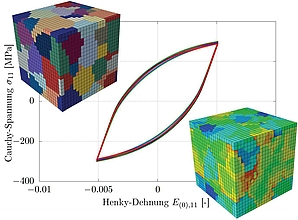 Die Lebensdauer von zyklisch belasteten metallischen Komponenten ist meist durch die Ermüdung der eingesetzten Werkstoffe begrenzt. Teilweise Irreversibilität der zyklischen Verformung führt zu Dehnungslokalisierung, Rissbildung und -ausbreitung und schließlich zum Bruch. Insbesondere ergeben ungünstige Orientierungen der Körner und Korngrenzen zusätzliche Spannungskonzentrationen, so dass selbst bei makroskopisch elastischen Deformationen lokale Plastizität in den Körnern auftritt. Diese lässt sich durch herkömmliche makroskopische Werkstoffmodelle nicht berücksichtigen. Von besonderer Bedeutung ist der Bauschinger-Effekt, über den sich die richtungsabhängige Verfestigung des Werkstoffs beschreiben lässt. Um ein grundlegendes Verständnis zum Bauschinger-Effekt gewinnen zu können, werden beim Projektpartner am Institut für Eisenhüttenkunde (IEHK) der RWTH Aachen mikromechanische und makromechanische Versuche und mikrostrukturelle Untersuchungen (Rasterelektronenmikroskopie mit EBSD/FIB und Transmissionselektronenmikroskopie) durchgeführt. Auf deren Grundlage werden Einkristall- und Vielkristallplastizitätsmodelle entwickelt, die eine explizite Einbeziehung des Bauschinger-Effekts in Finite-Elemente Berechnungen ermöglichen. Ziel ist die Identifikation von Zusammenhängen zwischen Ein- und Polykristallverfestigung. Dafür werden mikrostrukturbasierte Finite-Elemente-Modelle hinsichtlich des Zusammenhangs der kinematischen Verfestigung von Verformungsinkompatibilitäten durch unterschiedliche Kornorientierungen, dem Verhältnis von Korn- zu Modellgröße sowie der kinematischen Verfestigung im einzelnen Korn untersucht. Auf Grundlage der aus den mikrostrukturbasierten Berechnungen erzielten Ergebnisse werden die Werkstoffkennwerte geeigneter makroskopischer Plastizitätsmodelle ermittelt und in Zusammenhang zu den auf die Gleitsysteme bezogenen Kennwerten gestellt. Durch den Vergleich der lokalen Rückspannungstensoren mit dem makroskopischen Rückspannungstensor können Aussagen zum Beitrag der Inhomogenität zum Bauschinger-Effekt getroffen werden. Verifikationsexperimente an zwei technisch bedeutsamen Konstruktionswerkstoffen (Duplexstahl 1.4462 und Nickelbasissuperlegierung Alloy 718) werden die Möglichkeiten und Grenzen der Modelle aufzeigen.
