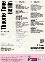 Die Veranstaltungsreihe „Forum Literaturtheorie“ bietet Nachwuchswissenschaftler:innen und fortgeschrittenen Studierenden aller philologischen Fächer die Gelegenheit, eigene Projekte im Bereich der Literaturtheorie vorzustellen und gemeinsam mit anderen zu diskutieren. Das 5. Forum fand vom 6.–8. Oktober 2025 als Präsenz-Tagung unter dem Titel „Theorie-Tage Berlin“ an der Humboldt-Universität zu Berlin statt und diente dem konstruktiven Austausch, der gegenseitigen Vernetzung und der Diskussion von literaturtheoretischen Projekten im Entstehungsprozess. Dabei wurden sowohl Überlegungen aus Abschluss- und Qualifikationsschriften präsentiert, die kurz vor dem Abschluss stehen, als auch konzeptionelle Entwürfe zu Arbeiten, die sich noch in der Entstehung befinden.